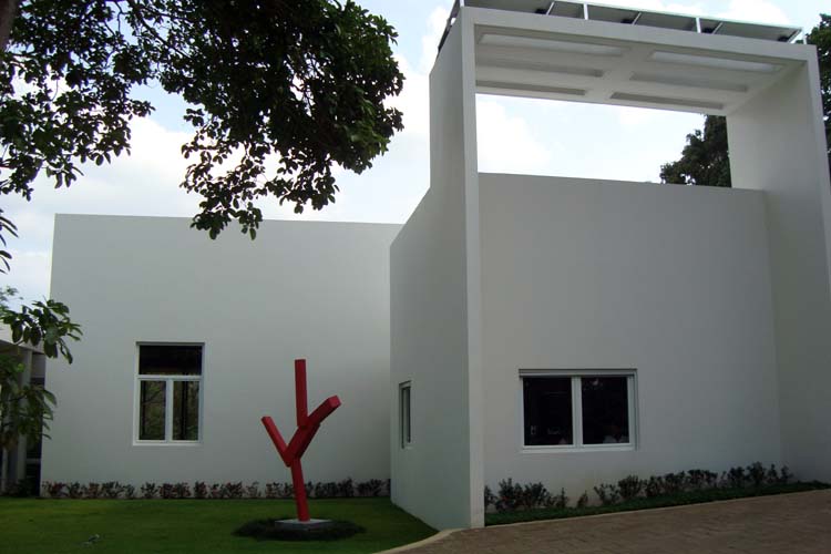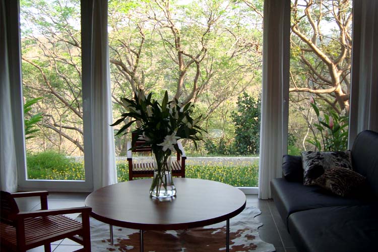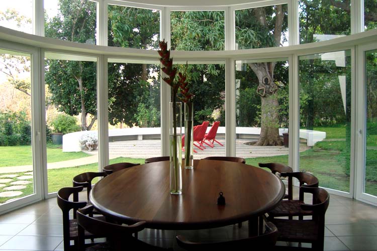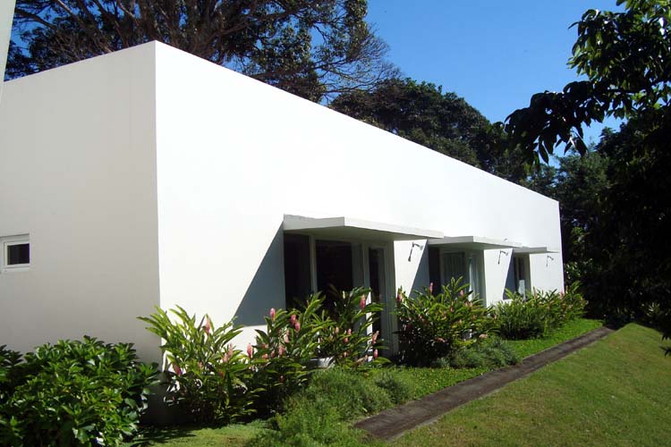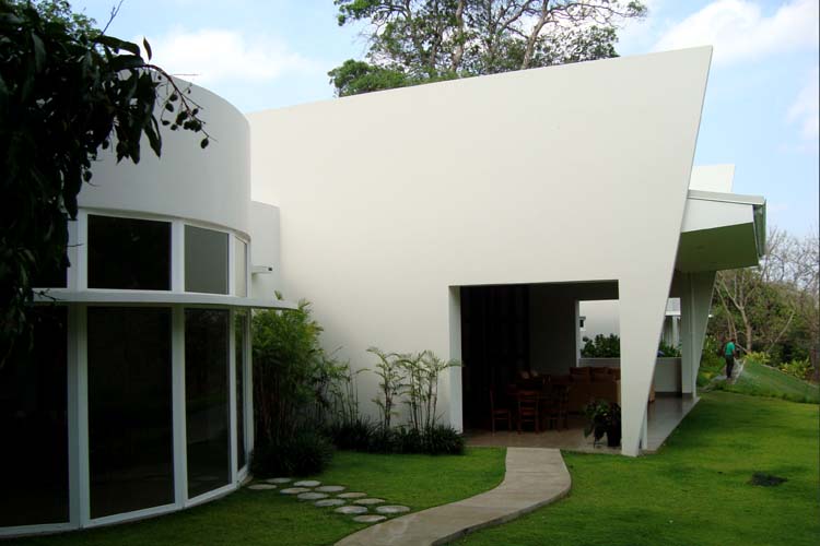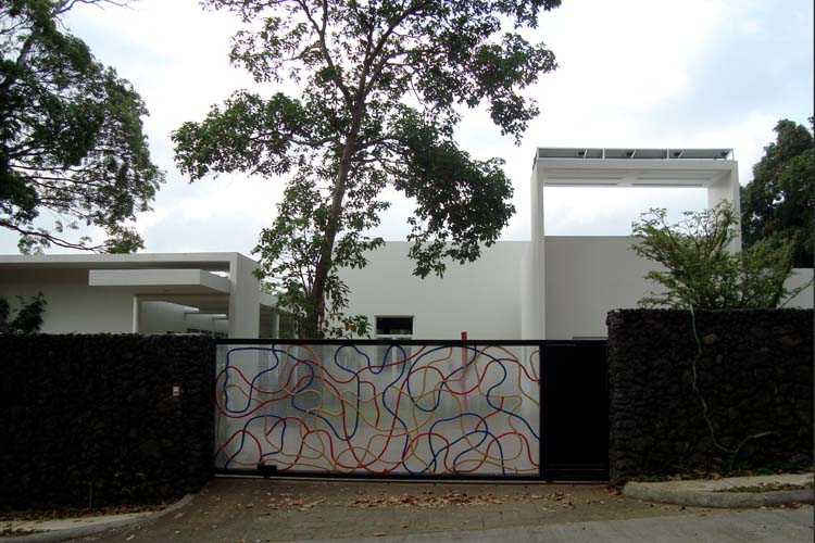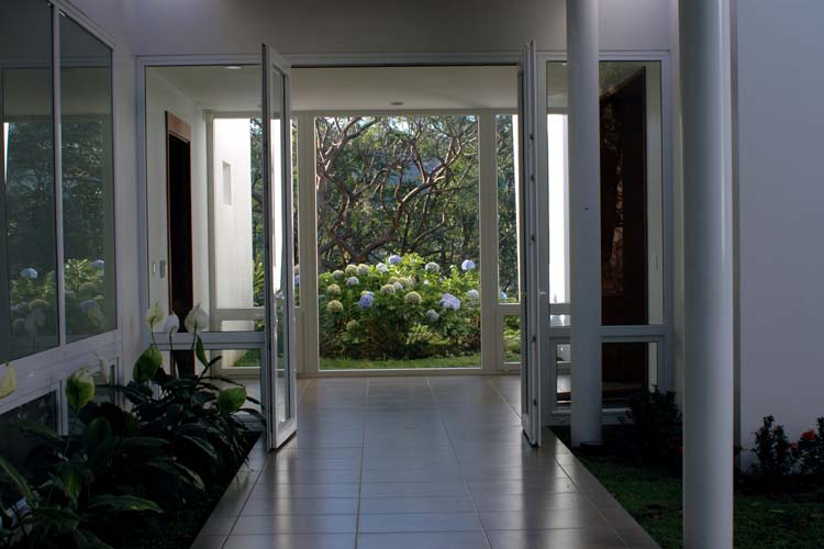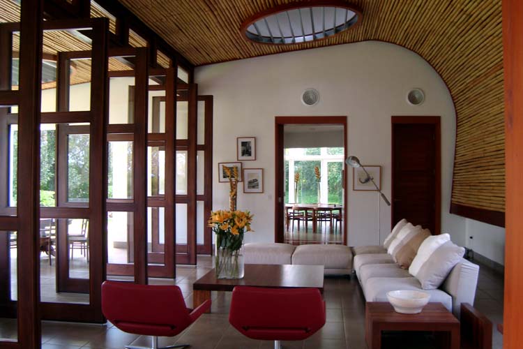 The design of this house focuses on green technology and the ecological considerations of the site. The house uses solar panels for electricity, “light tubes,” small flexible skylights that provide natural light to dark areas during the day, and solar shading devices on most openings to reduce solar heating load. The design also incorporates readily available renewable bamboo, as well as local materials such as volcanic rock and native wood species. The house has a linear design and sits at the edge of a ravine to take advantage of breezes and views. The solar technology, room cross ventilation and other measures such as passive ventilation of ceilings and the use of insulation keep the house cool in this tropical climate. The slope of the ravine is planted with coffee and tropical fruit trees.