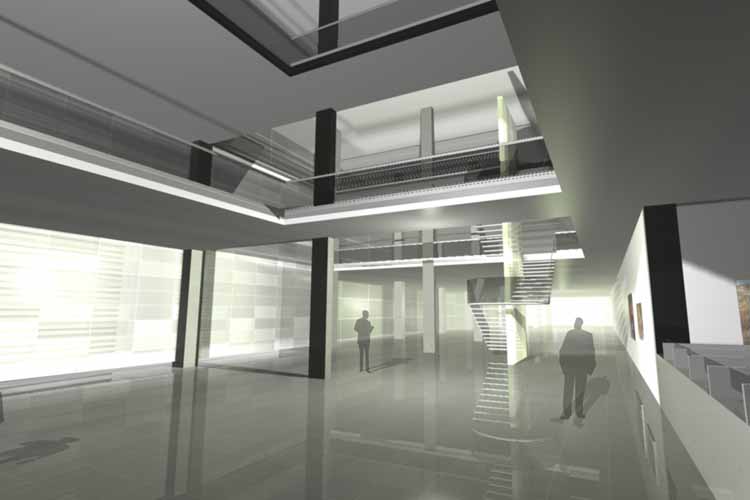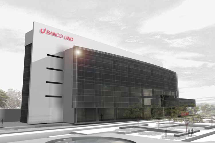 Located on an important intersection in the new business center of the city, the design for the headquarters for Banco Uno in Managua is a five story 40,000 s.f. building which comprises a bank and a prestigious office complex. The building responds to the frontage on the main highway with a long sliding forms of shear glass which evoke the speed of the passing automobiles. A lower two story piece slides away from the main office slab to create the main entrance, which leads to a double height banking hall. The eastern façade is all glass and takes advantage of views of the city and Lake Managua. In contrast, the western façade has smaller discrete openings with projecting aluminum blades that shield the offices from the afternoon tropical sun. Grupo Uno was acquired by Citibank in 2008. This project was a joint venture with arquitect Camilo Rosales.